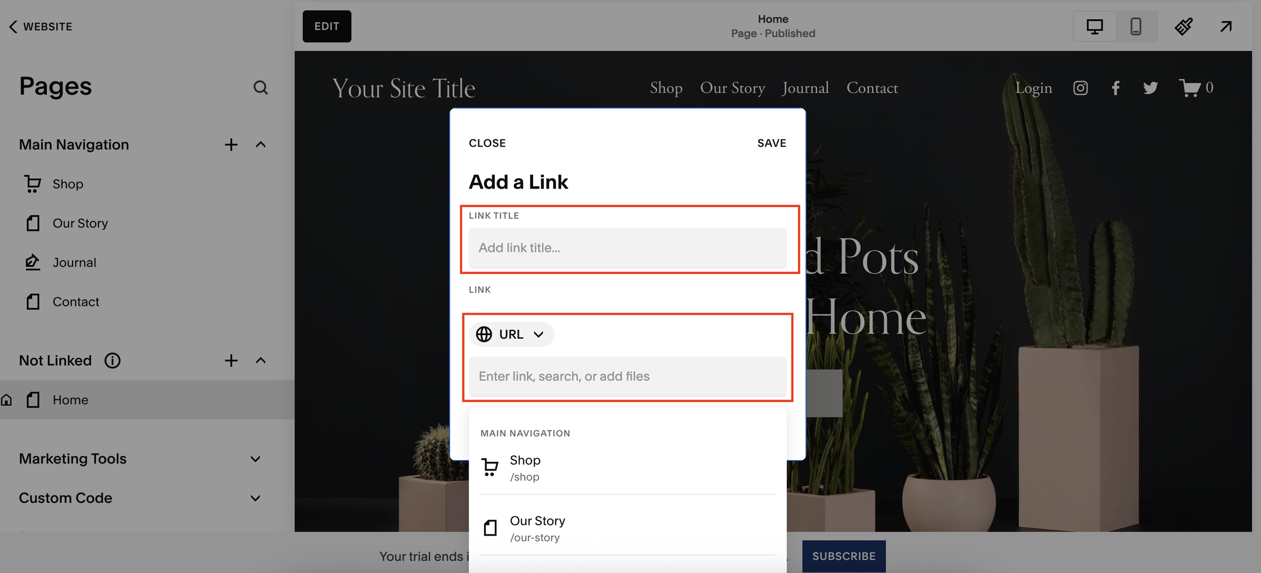 From your Squarespace dashboard, head over to Pages. Here you'll see your Main Navigation section.