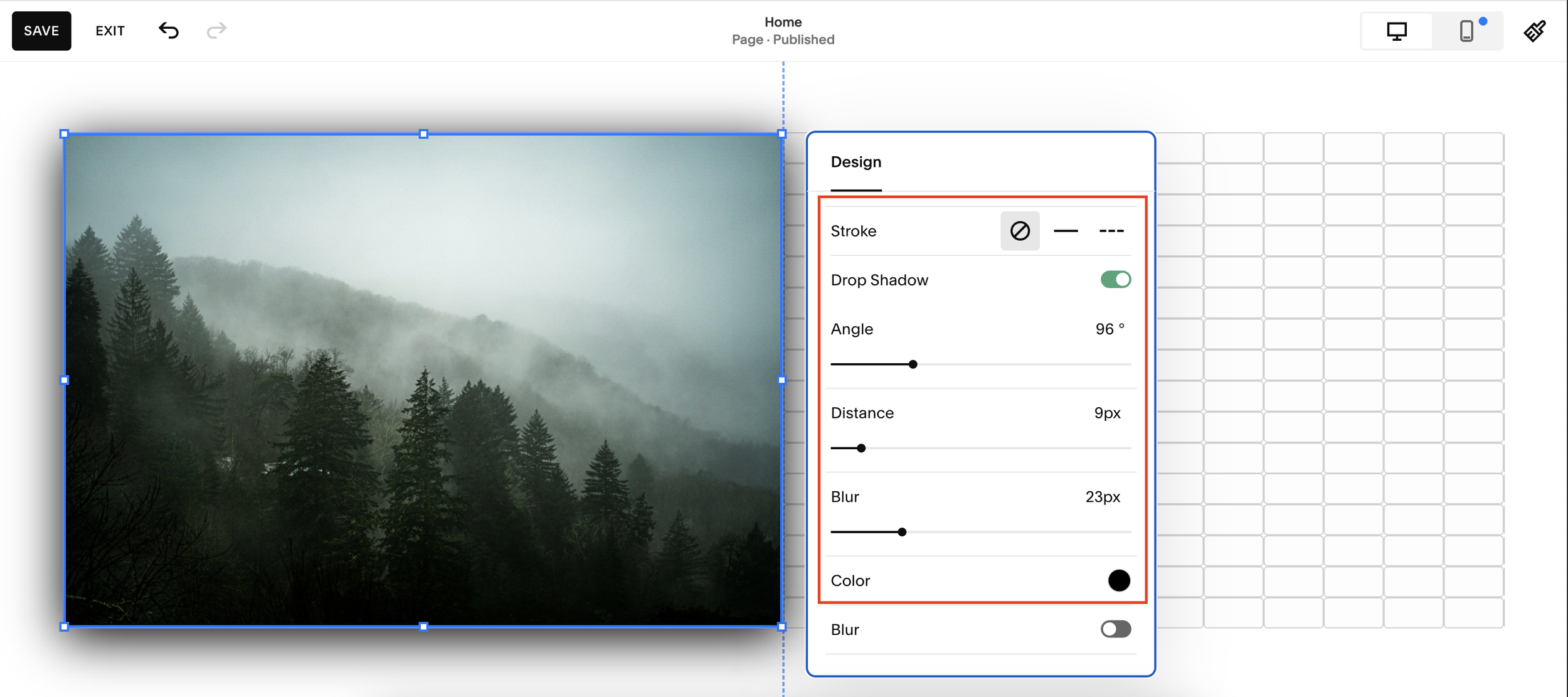 You can also change the opacity of the shape block (and therefore the drop shadow). Once you’ve edited the shape, you need to toggle on Drop Shadow.