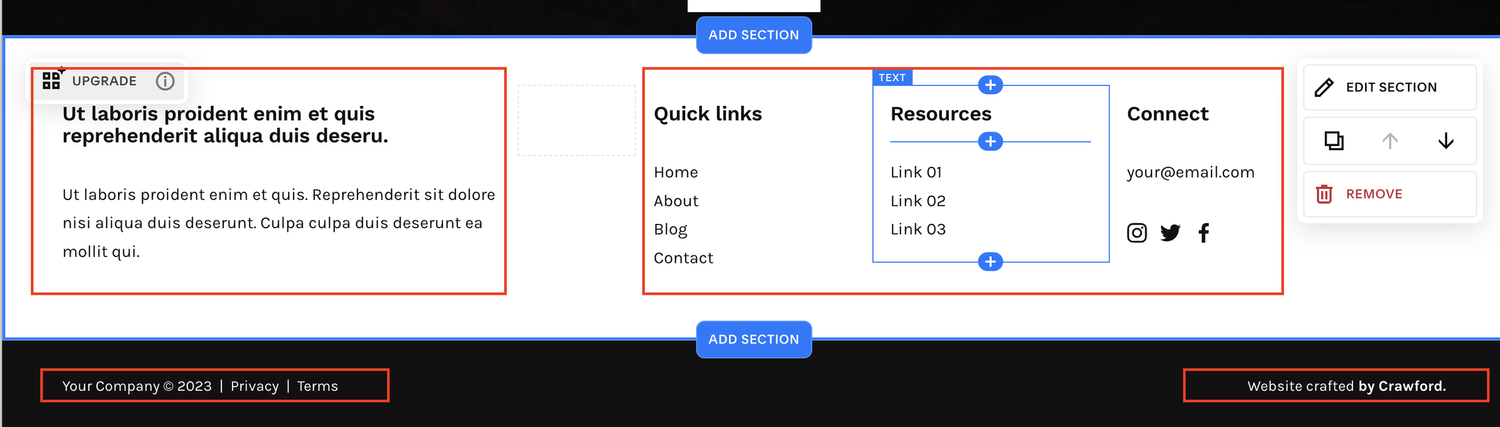You can also edit the formatting of your section, I recommend simply making it “small” in height, footers don’t need to be huge and take up too much space on the page.