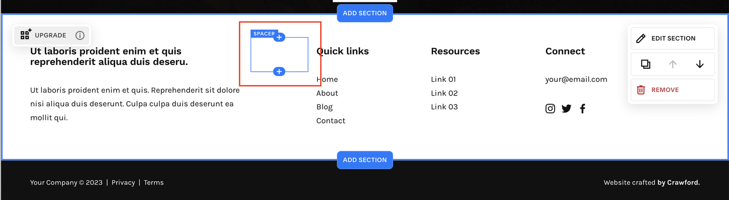 Within your section you can then add all of the blocks you want to appear in your footer such as text blocks and social media links. Don’t forget to use spacer blocks too in order to get the desired design effect.