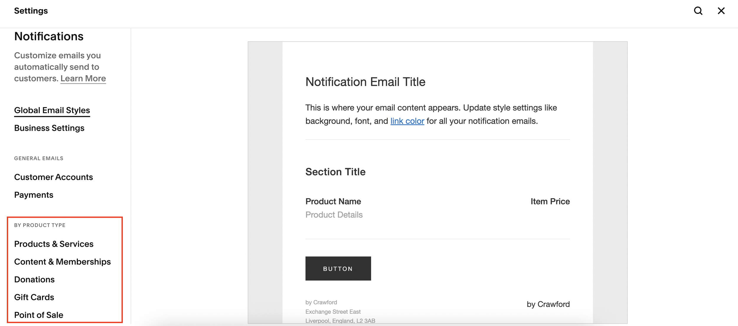 Here you’ll see your Global Email Styles (colors, button styles, and fonts) as well as deeper options for different types of notifications.