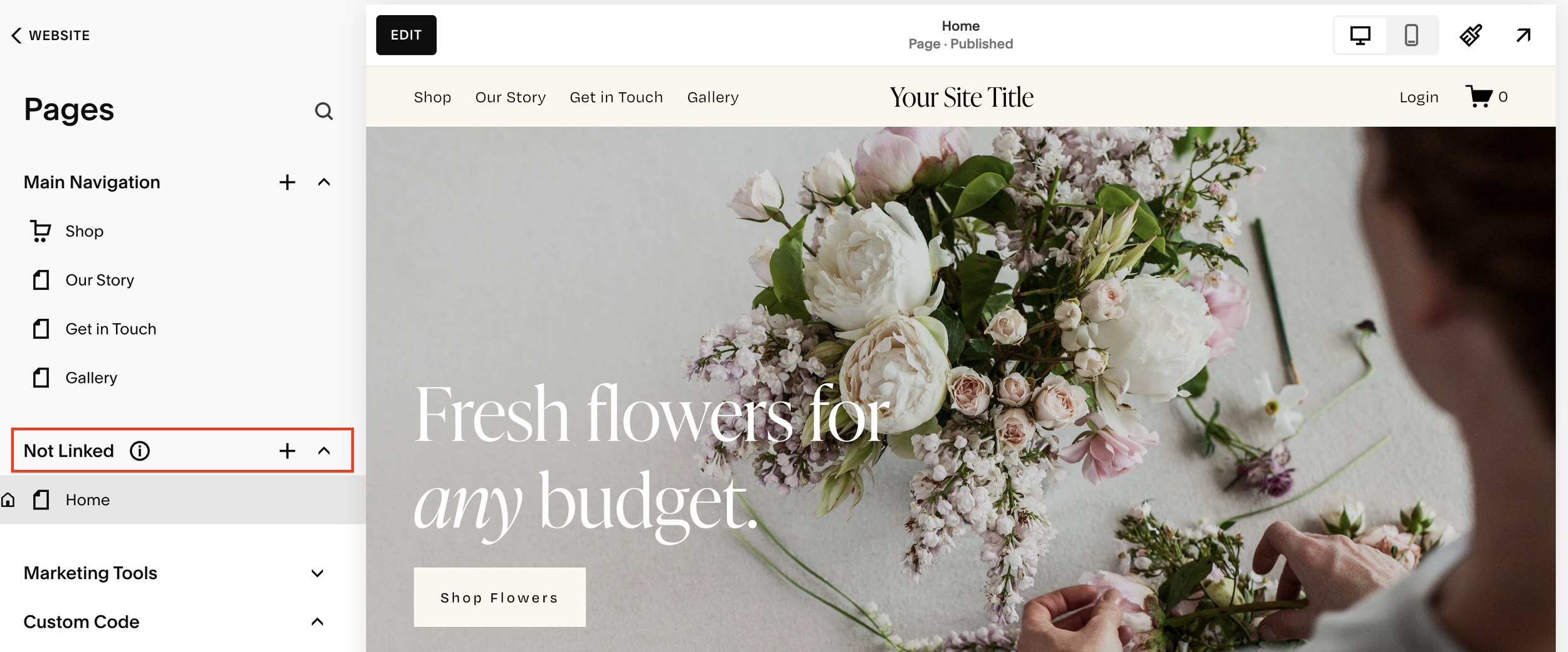 Scroll to the Not Linked section, this is where you’ll keep private pages that don’t appear in your main navigation.