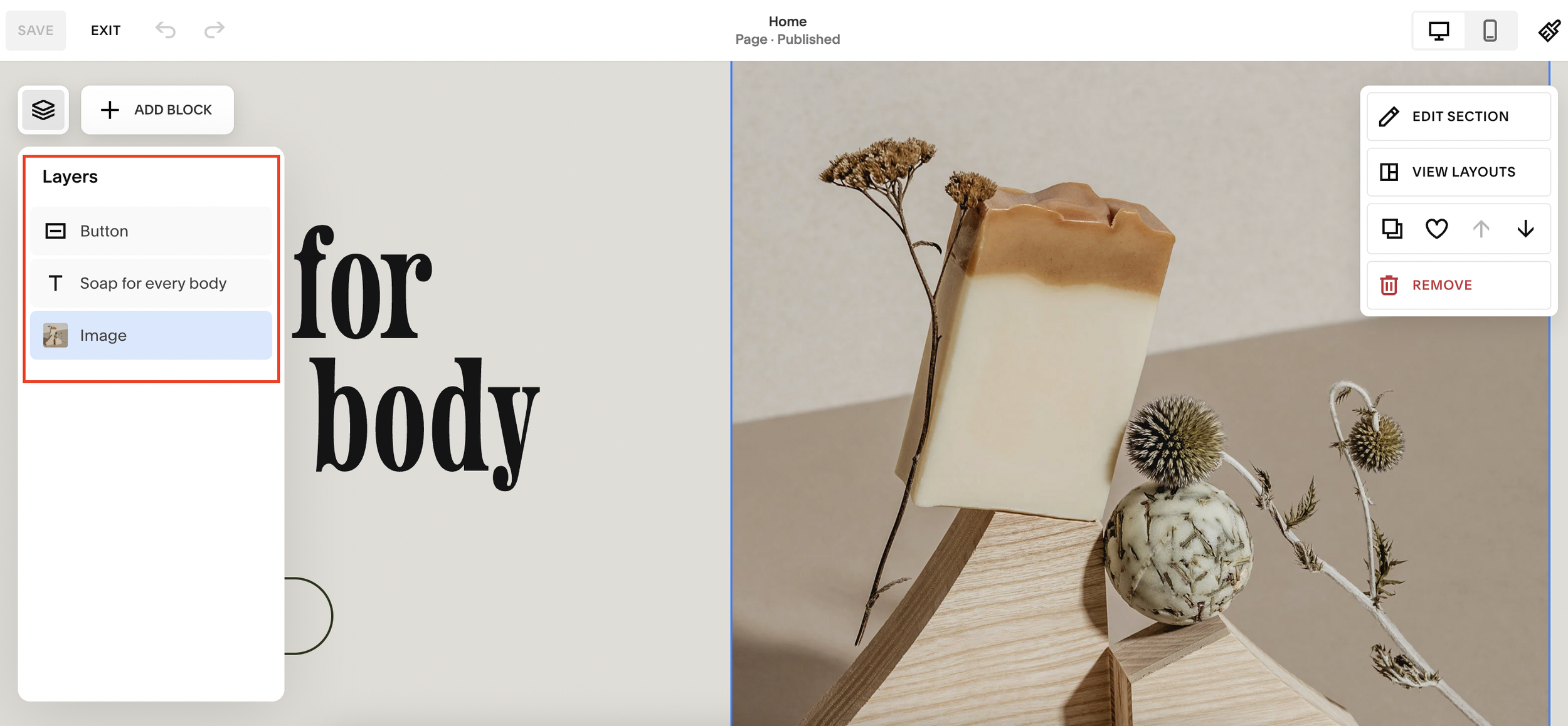 Layers give you a bird’s-eye view of every element within a section of your page, images, buttons, text blocks, and more. Think of it like Photoshop or Figma: you can see all your content “stacked” and edit each element individually.