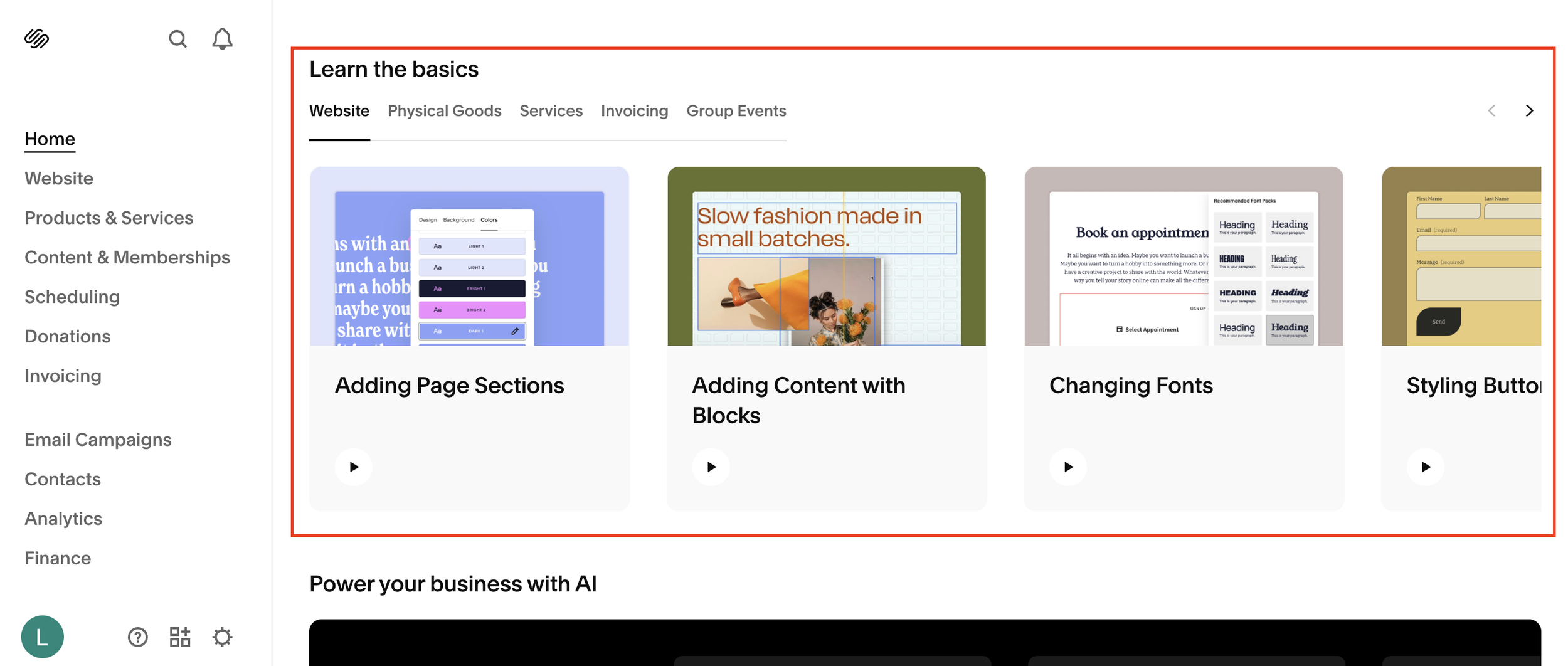 Scrolling further, you’ll find a section dedicated to Squarespace basics, bite-sized tutorial videos covering: