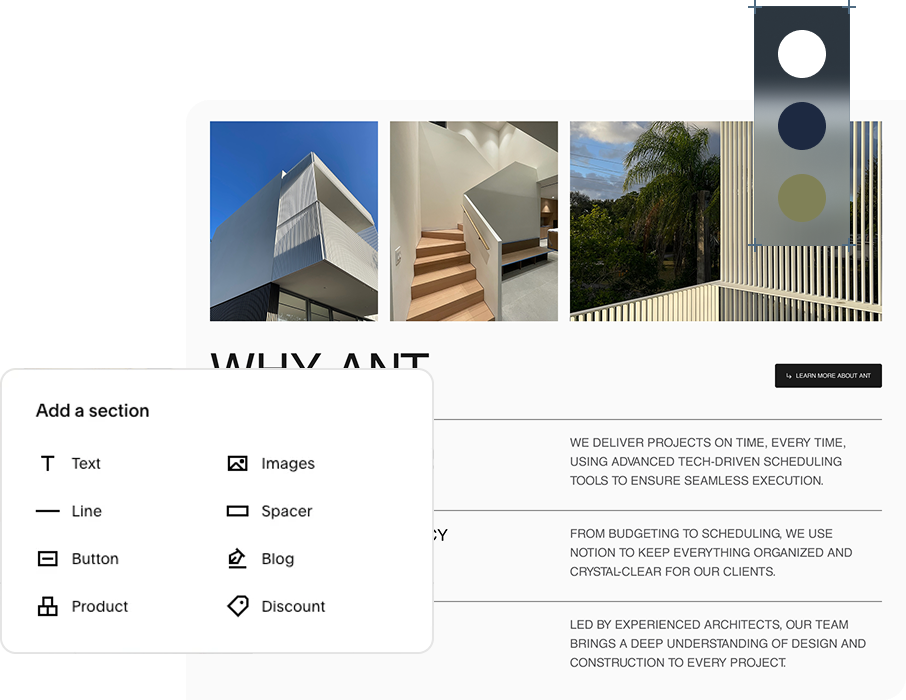 Automatically adapt your site’s style, fonts, and color palette to perfectly match your brand’s tone, vibe, and identity.